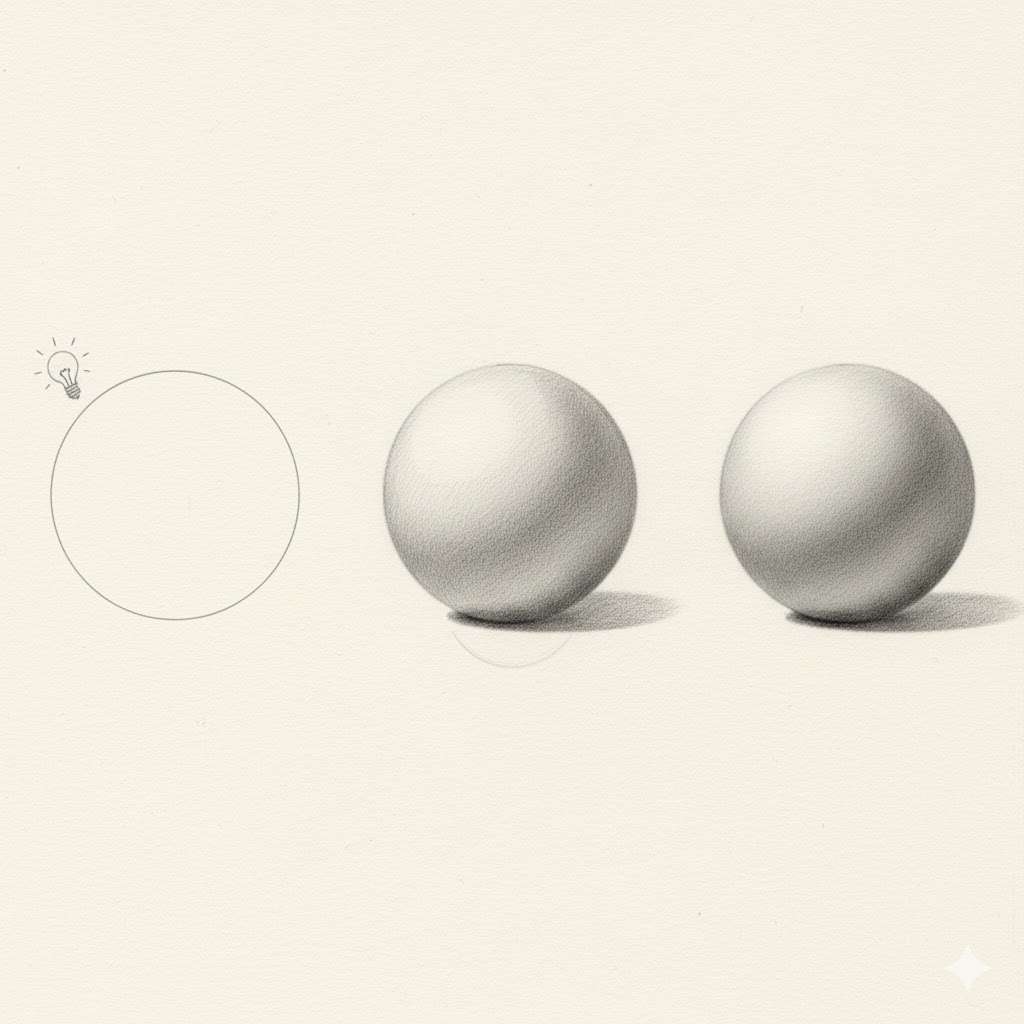 (Bild 3: Eine Abfolge von drei kleinen Bildern: 1. Eine einfache Kreislinie. 2. Der Kreis wird zu einer Kugel mit einer Lichtquelle und dem Beginn der Schattierung. 3. Die vollständig schattierte Kugel mit einem Schlagschatten, die deutliches Volumen zeigt.)