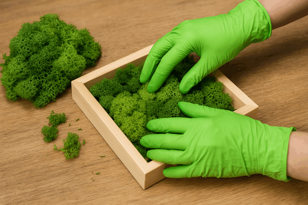 Auch wenn das Moos konserviert ist, bleibt es ein Naturmaterial. Handschuhe schützen vor kleinen Schmutzpartikeln und Harzspuren.